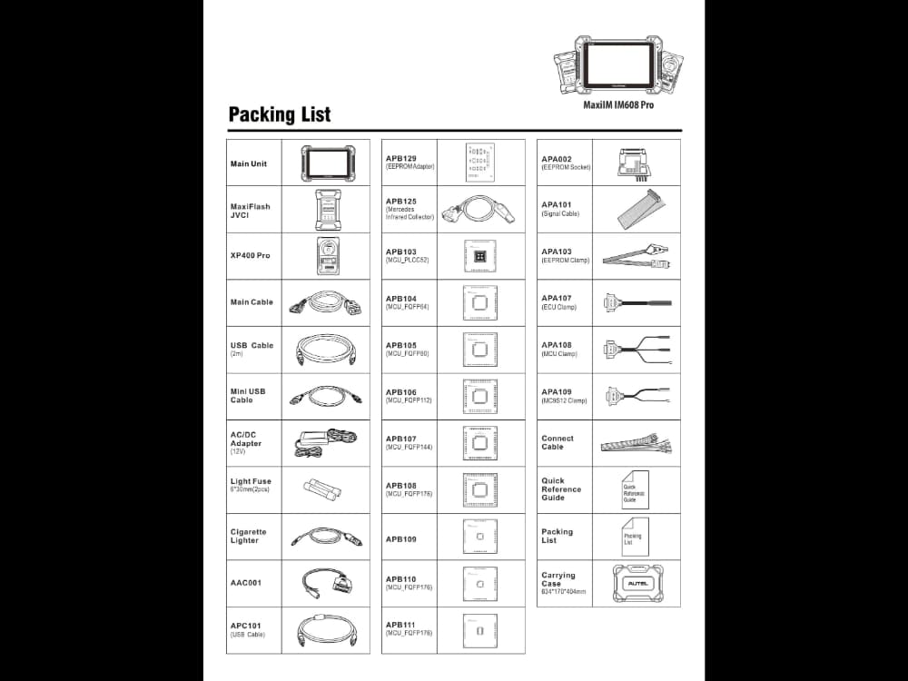 The IM608 PRO II comes complete with MaxiFlash JVCI+, XP400Pro, G-BOX 3, EEPROM Adapter and Socket Kit, MCU Adapter Kit, APB112, Mercedes key, IMKPA chipset and various other accessories, allowing the user to get started immediately fully equipped.